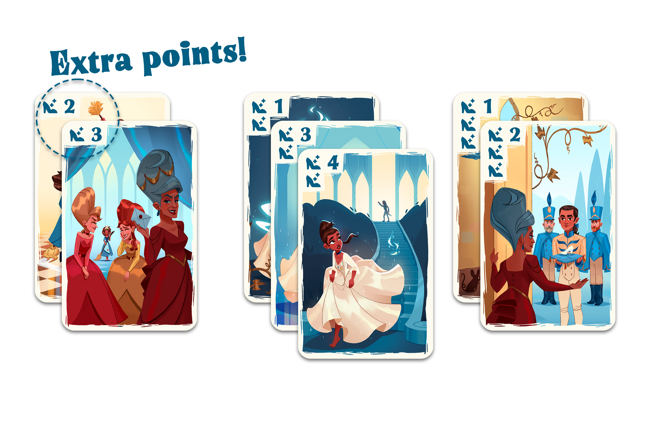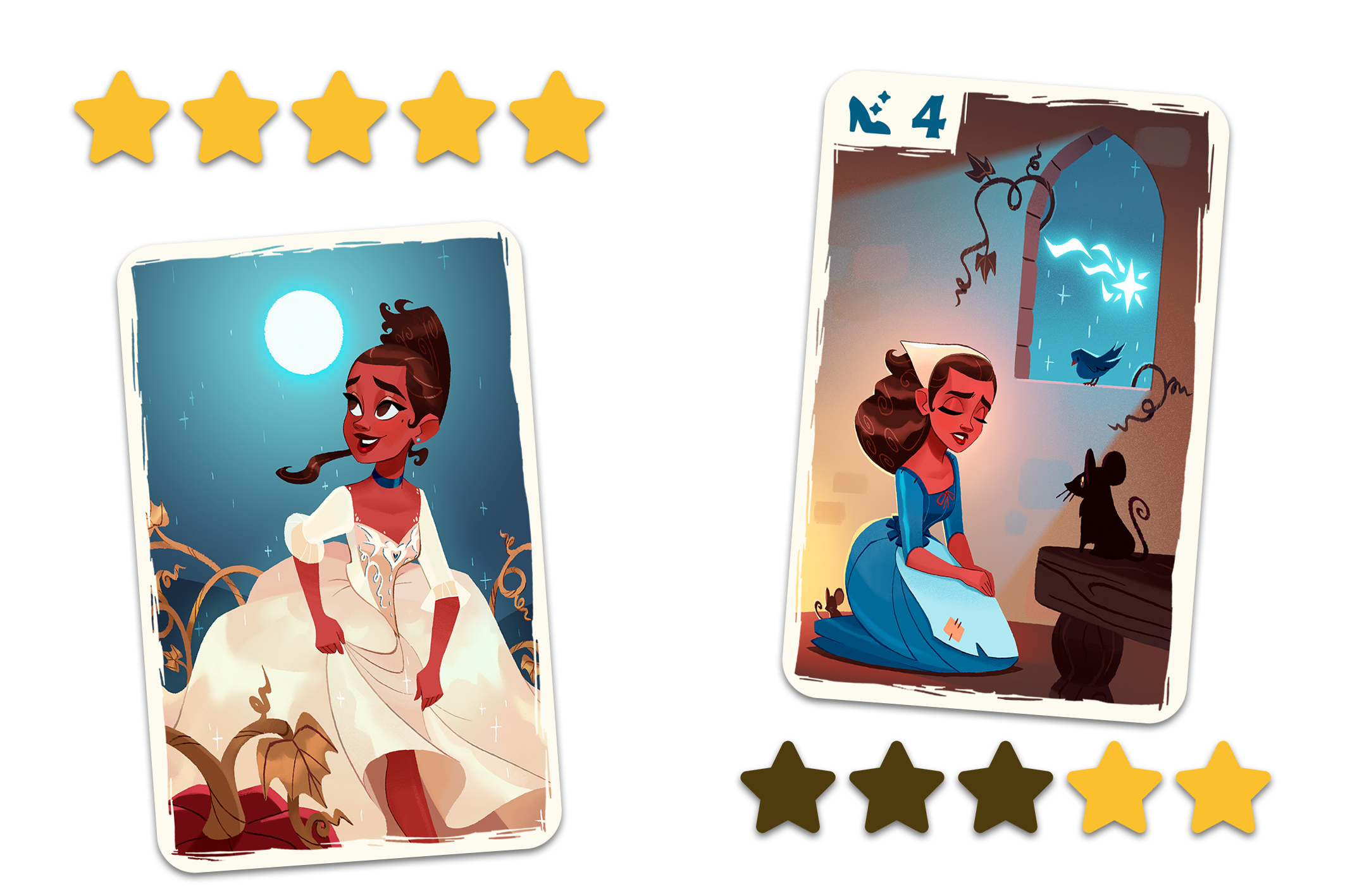 At the end of the game, each fable will be judged by the public and receive a popularity rating. If all the cards from the story were played during the game, it would get the highest rating, granting extra points.