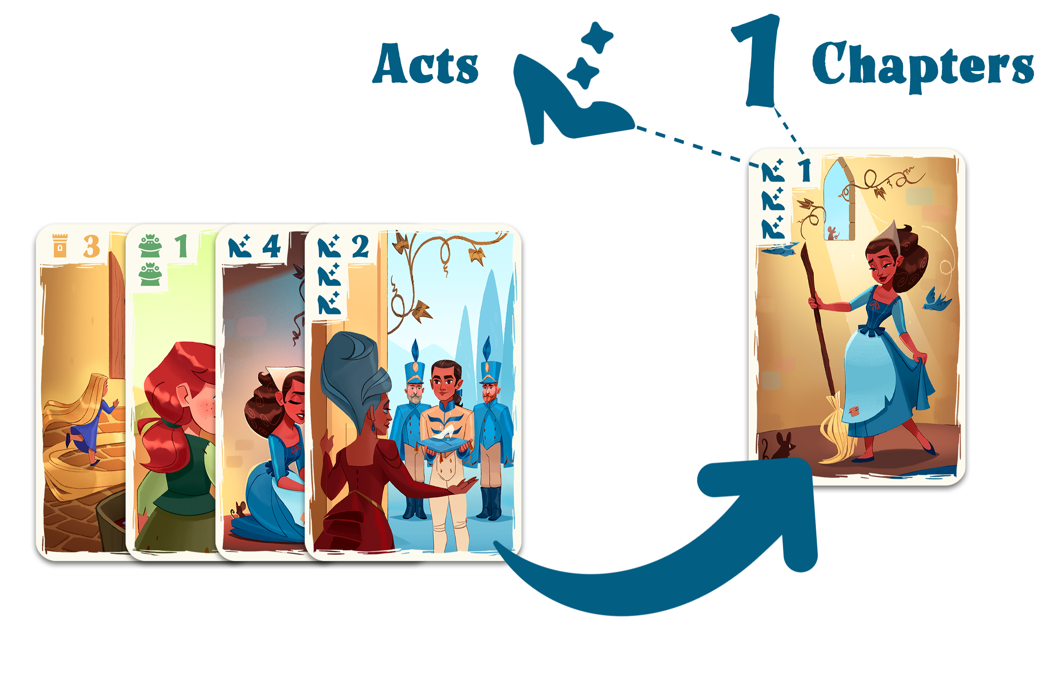 Play chapter cards from the (soon to be) beloved stories of the Grimm’s. Throughout the game, you’ll be organizing Acts and Chapters.